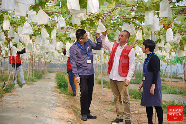 厦门市同安区纪委监委组织力量走访各镇(街)部分农业合作社,围绕乡村振兴、惠农助农等政策资金落实情况加强监督检查,助力实现农业高质高效、乡村宜居宜业、农民富裕富足。图为同安区纪检监察干部在五显镇竹山村走访葡萄种植农户。(厦门市同安区纪委监委 杨怡曼 摄)