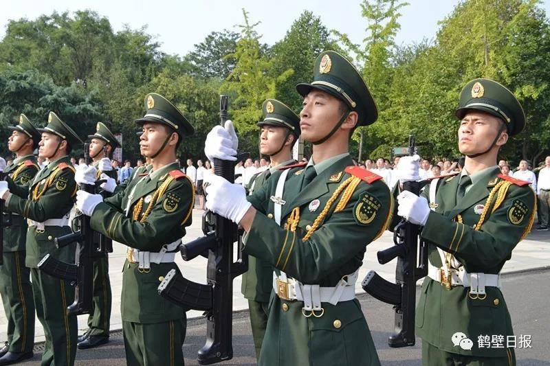 上午9时,来自武警鹤壁市支队的礼兵迈着整齐划一、铿锵有力的步伐,端枪护卫国旗进入升旗区域。