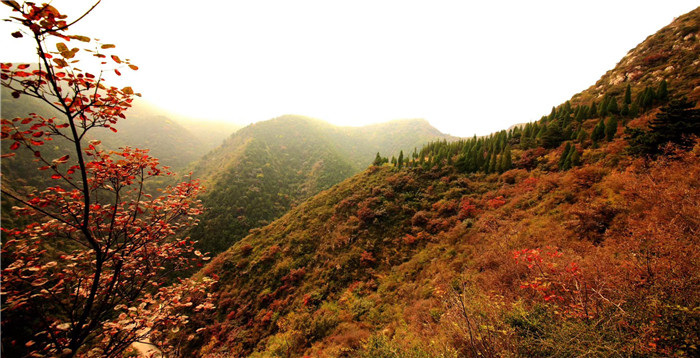 路转峰回出画塘 一山枫叶背残阳
