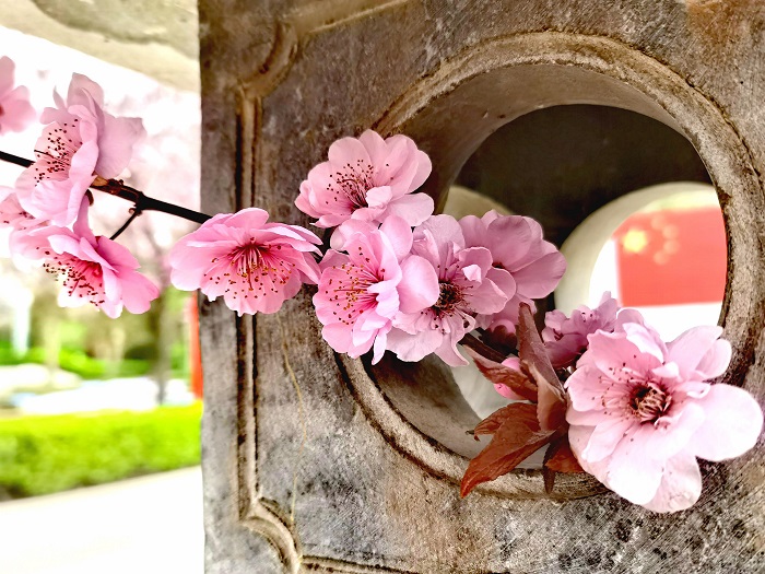 在街头寻得一枝春,从阑干圆孔中探出。从圆心望去,隐约是一方中国红。(宝山经开区纪工委朱楠摄)