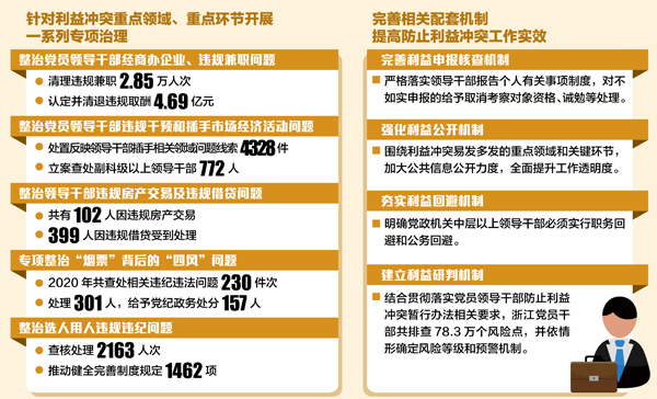 持续强化利益冲突问题专项治理。坚持问题导向,针对利益冲突重点领域、重点环节开展了一系列专项治理。一是严肃整治党员领导干部经商办企业、违规兼职问题。明确领导干部配偶、子女及其配偶从业行为“五个不准”,近年来持续开展违规兼职专项整治,清理违规兼职2.85万人次,认定并清退违规取酬4.69亿元。二是严肃整治党员领导干部违规干预和插手市场经济活动问题。近年来共处置反映领导干部插手相关领域问题线索4328件,立案查处副科级以上领导干部772人。三是严肃整治领导干部违规房产交易及违规借贷问题。在全省党员领导干部进行自查填报基础上,经重点核查,共有102人因违规房产交易、399人因违规借贷受到处理。四是专项整治“烟票”背后的“四风”问题。2020年共查处相关违纪违法问题230件次,处理301人,给予党纪政务处分157人。五是严肃整治选人用人违规违纪问题。结合省委巡视工作中选人用人专项检查,聚焦违规破格提拔等突出问题,在全省开展基层选人用人突出问题专项整治,查核处理2163人次,推动健全完善制度规定1462项。