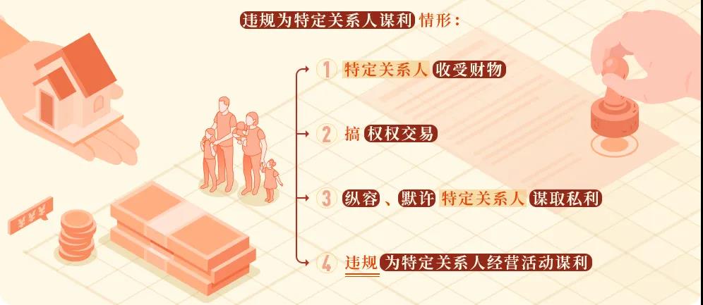 4.违规为特定关系人经营活动谋利。《条例》第一百零四条规定,利用职权或者职务上的影响,为配偶、子女及其配偶等亲属和其他特定关系人在审批监管、资源开发、金融信贷、大宗采购、土地使用权出让、房地产开发、工程招投标以及公共财政收支等方面谋取利益,情节较轻的,给予警告或者严重警告处分;情节较重的,给予撤销党内职务或者留党察看处分;情节严重的,给予开除党籍处分。利用职权或者职务上的影响,为配偶、子女及其配偶等亲属和其他特定关系人吸收存款、推销金融产品、经营名贵特产类特殊资源等提供帮助谋取利益的,依照前款规定处理。