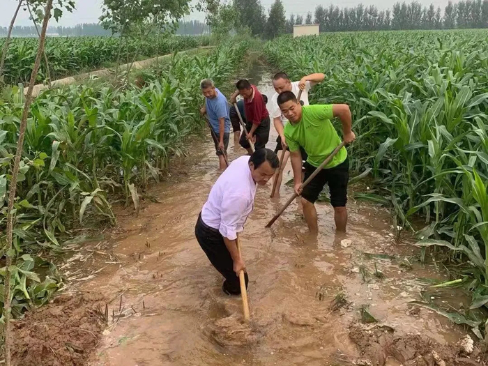 大雨过后,武陟县谢旗营镇张官滩村纪检监察干部同村两委干部带头疏通庄稼地,将田地里的积水排出,帮助减少群众损失。