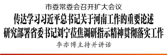 1月12日,市委常委会召开扩大会议,传达学习习近平总书记关于河南工作的部分重要论述,安排部署省委书记刘宁莅焦调研指示精神贯彻落实工作,研究网信、巡察等工作。市委书记李亦博主持并讲话。