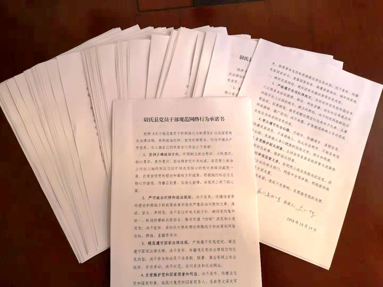 “网络行为是党员干部言行的重要组成部分,纪检监察干部更要发挥模范带头作用,自觉规范网络行为,积极营造健康向上、风清气正的网络环境,进一步提高利用网络的安全意识。”尉氏县纪委监察委相关负责人在签订承诺书现场说道。