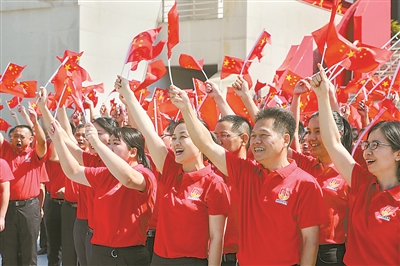 金秋时节,福州西湖在朝阳的映照下,波光粼粼、景色宜人。9月24日上午9时,一场别开生面的“歌唱祖国”主题快闪活动在西湖畔的福建博物馆广场上演。伴随着《歌唱祖国》《我和我的祖国》等激昂的歌声,福建省纪委监委近200名纪检监察干部挥舞着手中的国旗,从广场四周向中心汇聚,摆成巨大的“70”造型。不少围观市民掩饰不住内心的激动,自发加入其中,共同唱出对祖国母亲的赞歌。国庆临近,连日来,各地纪检监察机关开展丰富多彩的庆祝活动,以昂扬向上的精神风貌,喜迎新中国70华诞,为祖国母亲献上美好祝福。