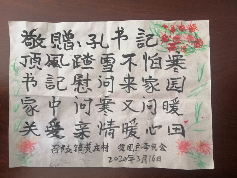 3月19日,召陵区委常委、区纪委书记、区监委代理主任孔德余收到来自该区召陵镇黄庄村贫困户李民会的一幅感谢画。画里面的四句诗“顶风踏雪不怕寒,书记慰问来家园。家中问寒又问暖,关爱亲情暖心田”表达了贫困户李民会的深深谢意。