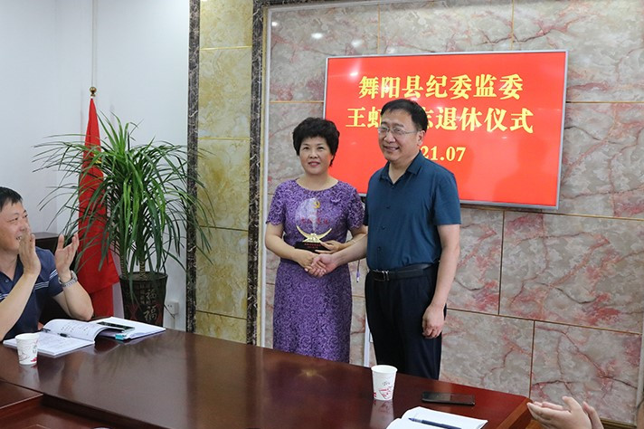 蔡良红指出,王虹同志曾在乡镇、县直等多部门多岗位工作,历任县直部门一把手,为舞阳经济社会发展做出了积极贡献,荣退仪式不仅是一个仪式,更是一份荣誉和肯定,一种颂扬和传承;希望退休干部要坚定理想信念,坚持思想武装不松懈,做到“退休不褪色”“离岗不离党”,培养良好的兴趣爱好,适应新生活、新状态。充分发挥好独特的政治优势和经验优势,多为在职在岗纪检监察干部提供指导和帮助,为舞阳经济社会发展献计献策、出谋支招,继续做出新的贡献。(舞阳县纪委监委 杨青 段莹)