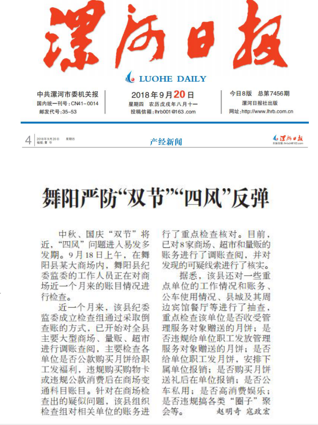 中秋、国庆“双节”将近,“四风”问题进入易发多发期。9月18日上午,在舞阳县某大商场内,舞阳县纪委监委的工作人员正在对商场近一个月来的账目情况进行检查。