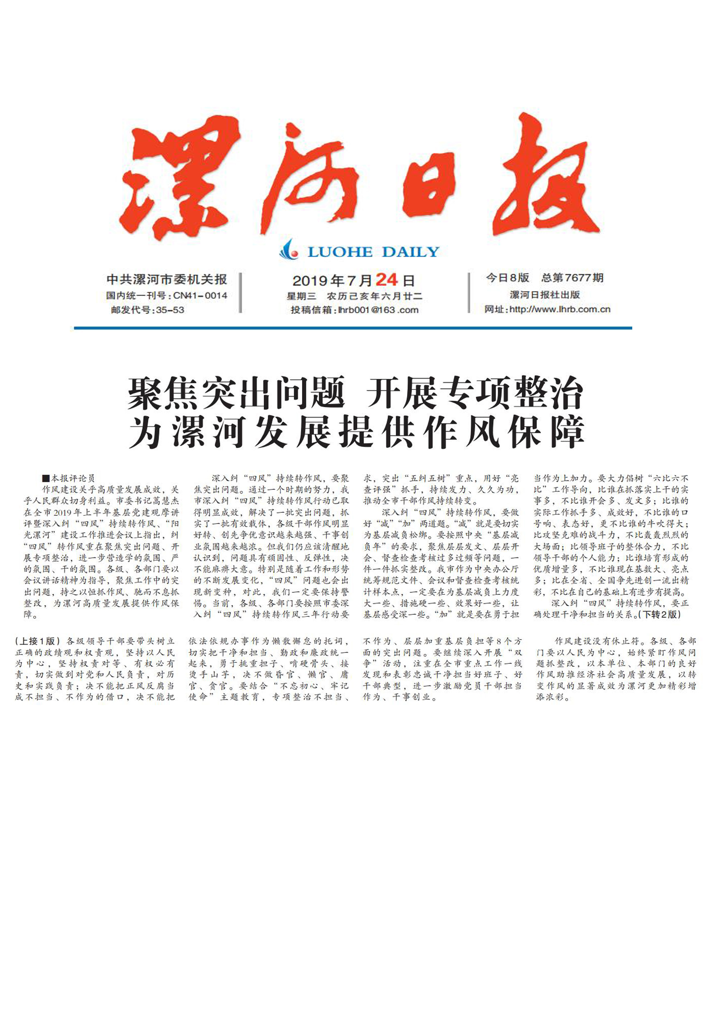 作风建设关乎高质量发展成效,关乎人民群众切身利益。市委书记蒿慧杰在全市2019年上半年基层党建观摩讲评暨深入纠“四风”持续转作风、“阳光漯河”建设工作推进会议上指出,纠“四风”转作风重在聚焦突出问题、开展专项整治,进一步营造学的氛围、严的氛围、干的氛围。各级、各部门要以会议讲话精神为指导,聚焦工作中的突出问题,持之以恒抓作风、驰而不息抓整改,为漯河高质量发展提供作风保障。