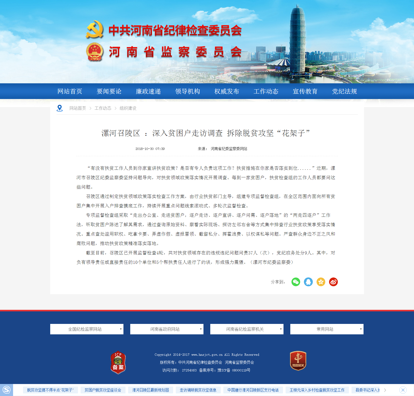 召陵区通过制定扶贫领域政策落实检查工作方案,由行业扶贫部门主导,组建专项监督检查组,在全区范围内面向所有贫困户集中开展入户排查摸底工作,持续开展重点问题线索滚动式、多轮次监督检查。