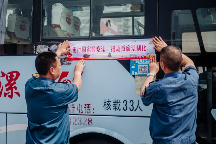 “施行国家监察法,推动反腐法制化……”100余辆张贴有监察法宣传标语的公交车行驶在漯河市的大街小巷,广大干部群众时时处处都能感受到监察法就在身边。(源汇区纪委监察委)