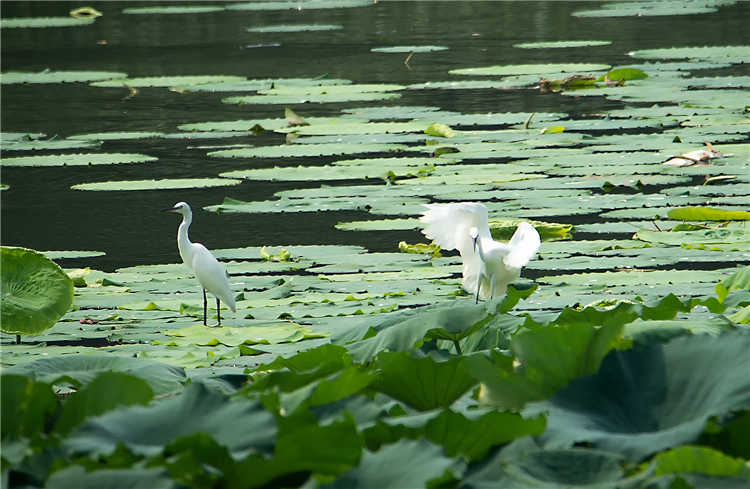 经过暑气的炙烤后,喧嚣的荷塘恢复了静谧,两只白鹭轻踏荷叶,展示着自己婀娜的身材,时而昂首驻足,时而翩翩起舞。