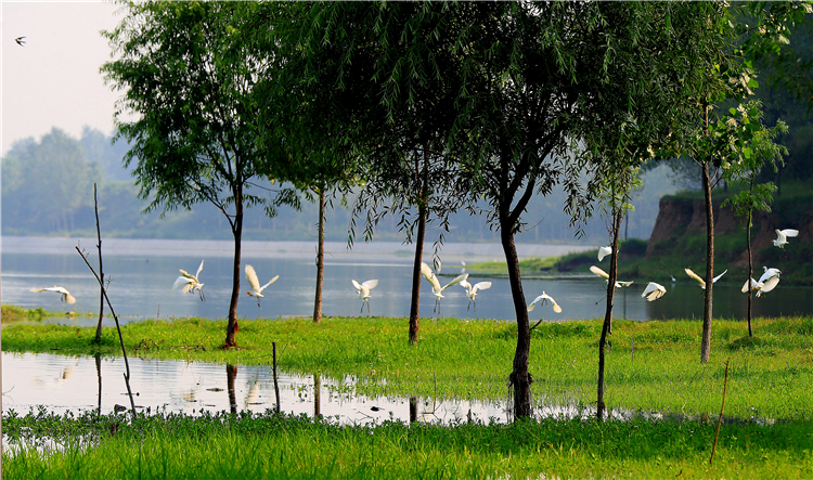 舞阳县莲花镇湿地公园,一群白鹭翩翩起舞,在自己的家园里尽情嬉戏,阐述着自然的优美与和谐。
