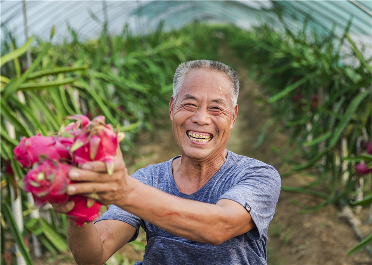 舞阳县辛安镇水牛刘村,新培育的火龙果品种初次在当地种植成功,果农手捧刚刚采摘的火龙果,丰收的喜悦写在脸上。