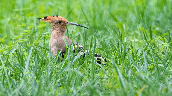 戴胜放下警觉,收起羽冠,在开阔草地里,时而翻动地面寻找食物,时而停下脚步欣赏春日美景。(焦作市山阳区纪委监委 马海芳 摄)