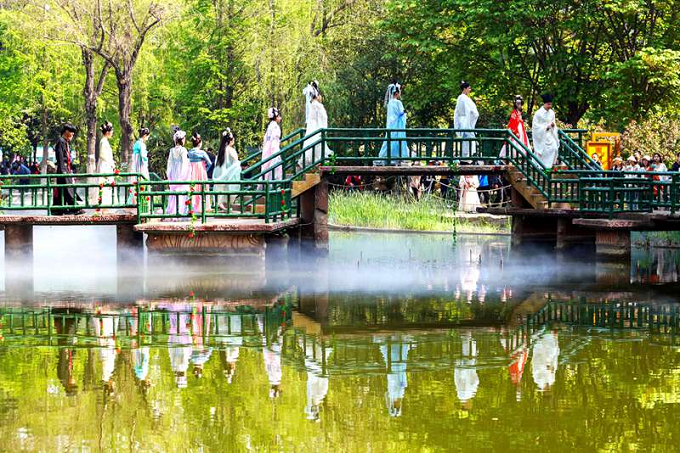 谷雨到,牡丹园中游人如织,姑娘们穿着汉服游园,一路说笑一路欢歌。桥上的游人和湖中的倒影相映成趣,好一幅春和景明的晚春图。(灵宝市纪委监委 花雪红 摄)