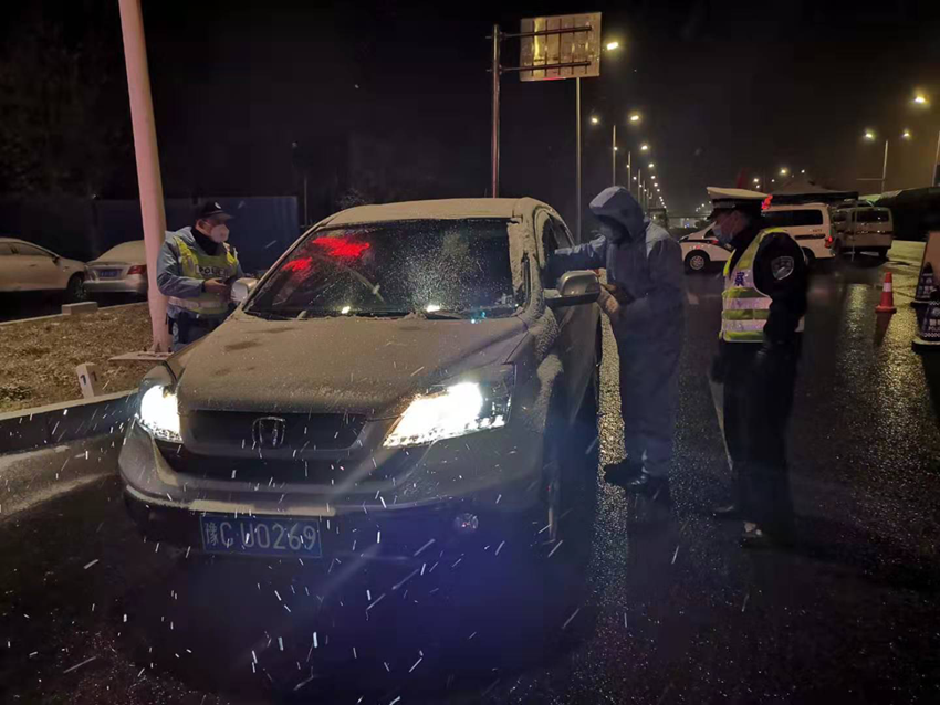 2月5日凌晨,河南省洛阳市吉利区交通卡口的执勤警察、检测人员认真检查通过卡点的车辆、人员。雪景、车灯、人影交织,这是难忘的时刻,也是平安的夜曲,守护的是春天的到来!