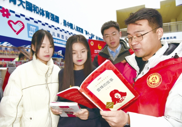 学雷锋纪念日临近,各地开展志愿服务活动,以实际行动践行雷锋精神。图为3月2日,在共青团青岛市委举行“学榜样 促实干 做志愿 共成长”青年志愿者集中服务行动中,青年志愿者为群众宣讲雷锋事迹。 新华社记者 李紫恒 摄