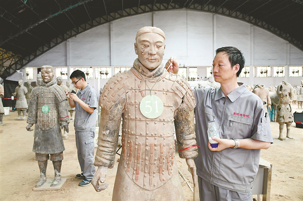 秦始皇帝陵博物院文物保护工作人员在兵马俑一号坑修复现场对新修复的兵马俑进行彩绘加固保护。新华社记者 李一博