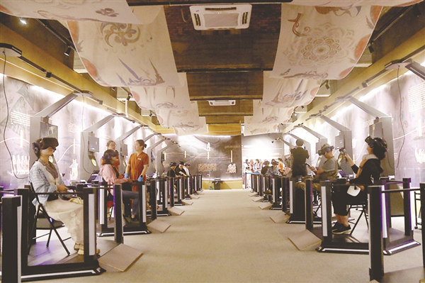 近日,在甘肃敦煌莫高窟,游客线下体验“寻境敦煌——数字敦煌沉浸展”,沉浸式感受敦煌文化的魅力。图片来源:视觉中国