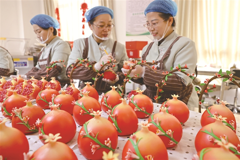 1月22日,山东省枣庄市的民间艺人在用面粉、果蔬汁等食材制作“红石榴”喜馍。 图片来源:视觉中国