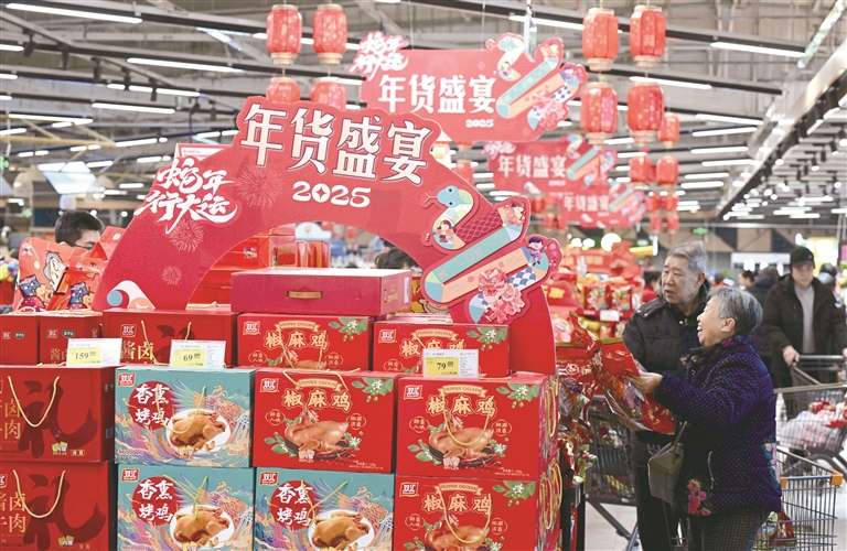 春节将至,人们纷纷赶年集、购年货,喜迎新年到来。1月24日,顾客在河北省石家庄市新华区北国超市中环店选购年货。 新华社发(陈其保 摄)
