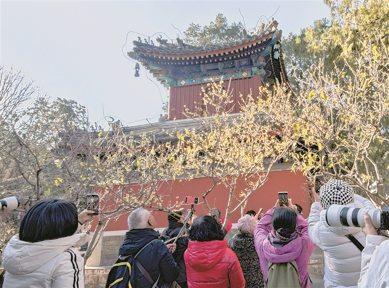近日,在国家植物园卧佛寺内,几株早花蜡梅盛开,与古建红墙相辉映,美不胜收,游客竞相拍照打卡。