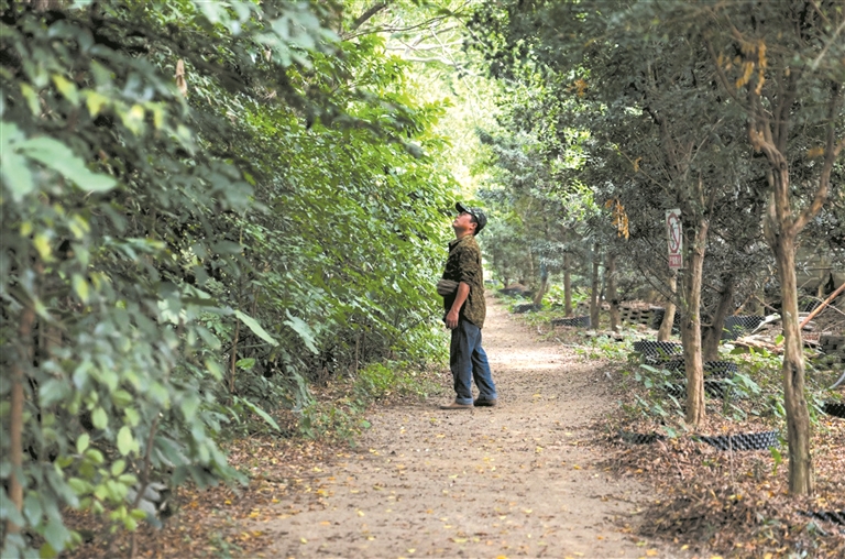 图为冼铨辉在湿地公园里观察鹭鸟。 新华社记者 卢汉欣 摄