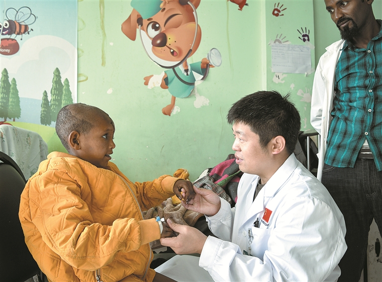 图为近日,在位于埃塞俄比亚首都亚的斯亚贝巴的蒂鲁内什-北京医院,中国第25批援埃塞俄比亚医疗队中方神经外科医生任玉伟在病房检查患儿状况。 新华社记者 韩旭 摄