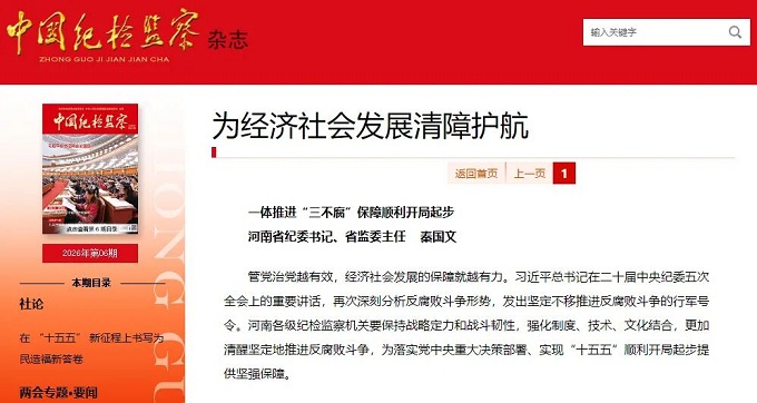 《中国纪检监察》杂志2026年第6期刊发河南省委常委、省纪委书记、省监委主任秦国文署名文章《一体推进“三不腐” 保障顺利开局起步》。