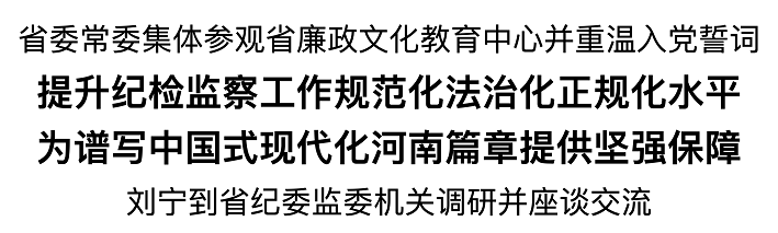 4月9日,省委书记刘宁带领省委常委班子集体参观省廉政文化教育中心,并重温入党誓词。刘宁还到省纪委监委机关调研并与纪检监察干部座谈交流,了解相关工作推进情况,听取意见建议。他强调,要深刻领悟“两个确立”的决定性意义,坚决做到“两个维护”,深入学习贯彻习近平总书记关于党的建设的重要思想、关于党的自我革命的重要思想、关于巡视工作的重要论述和关于河南工作的重要论述,认真贯彻二十届中央纪委四次全会精神,全面落实二十届中央第五轮巡视要求,推动全面从严治党、党风廉政建设和反腐败斗争向纵深发展,为谱写中国式现代化河南篇章提供坚强保障。省长王凯参加有关活动。