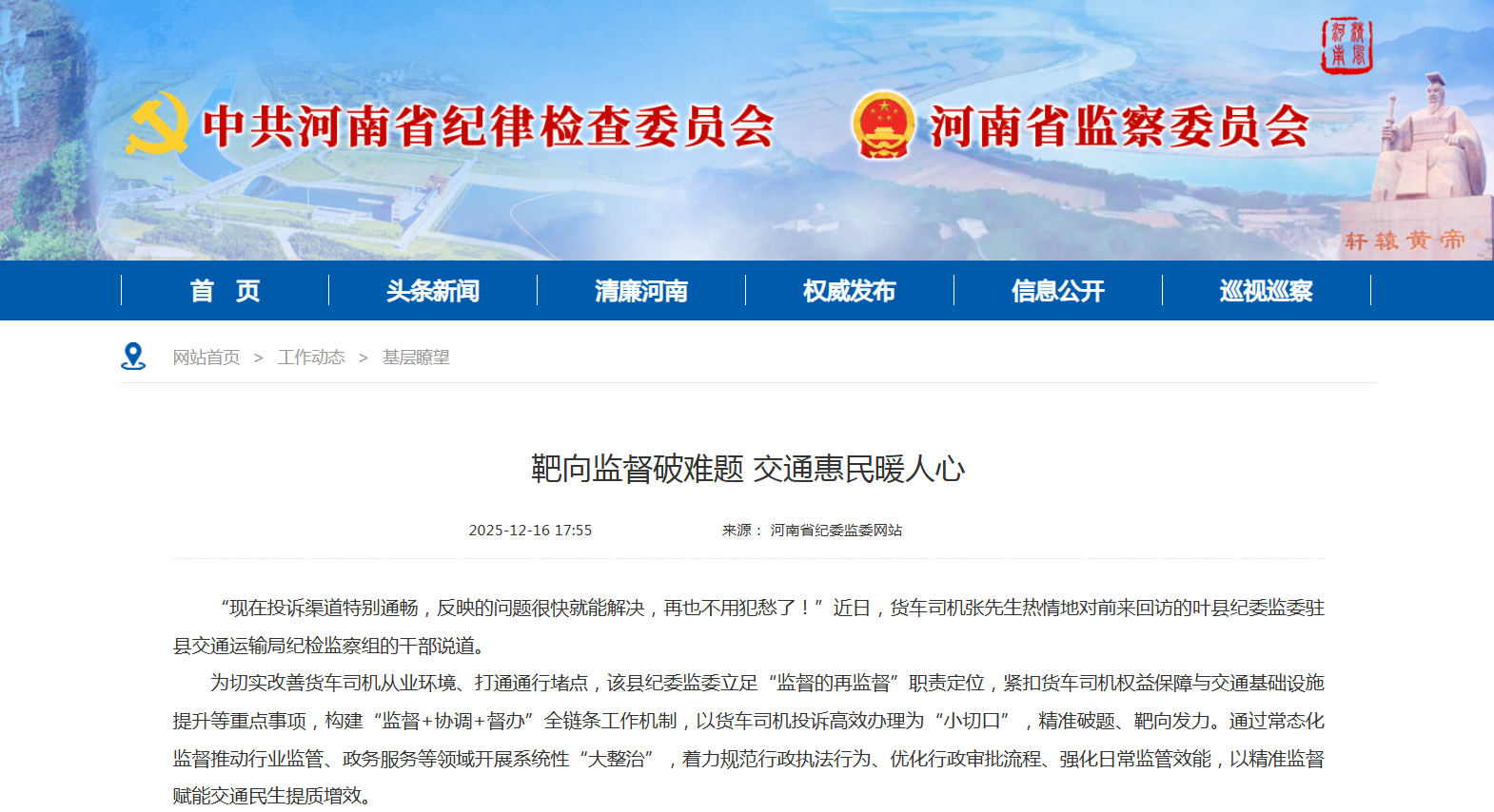 “现在投诉渠道特别通畅,反映的问题很快就能解决,再也不用犯愁了!”近日,货车司机张先生热情地对前来回访的叶县纪委监委驻县交通运输局纪检监察组的干部说道。