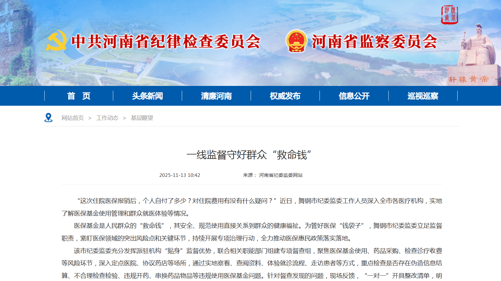 医保基金是人民群众的“救命钱”,其安全、规范使用直接关系到群众的健康福祉。为管好医保“钱袋子”,舞钢市纪委监委立足监督职责,紧盯医保领域的突出风险点和关键环节,持续开展专项治理行动,全力推动医保惠民政策落实落地。