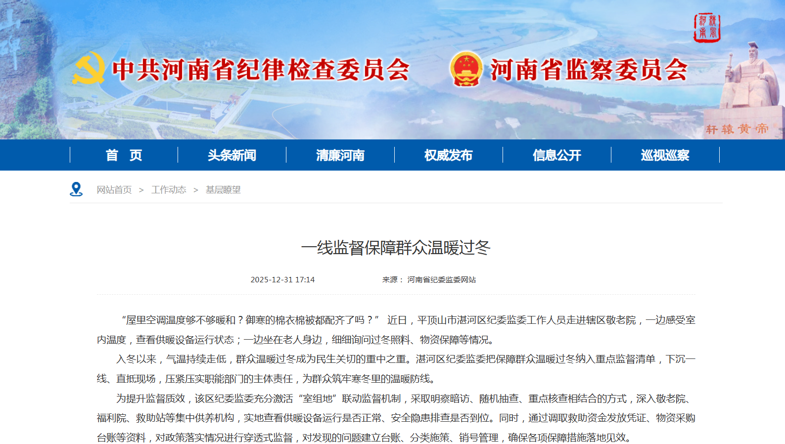 入冬以来,气温持续走低,群众温暖过冬成为民生关切的重中之重。湛河区纪委监委把保障群众温暖过冬纳入重点监督清单,下沉一线、直抵现场,压紧压实职能部门的主体责任,为群众筑牢寒冬里的温暖防线。