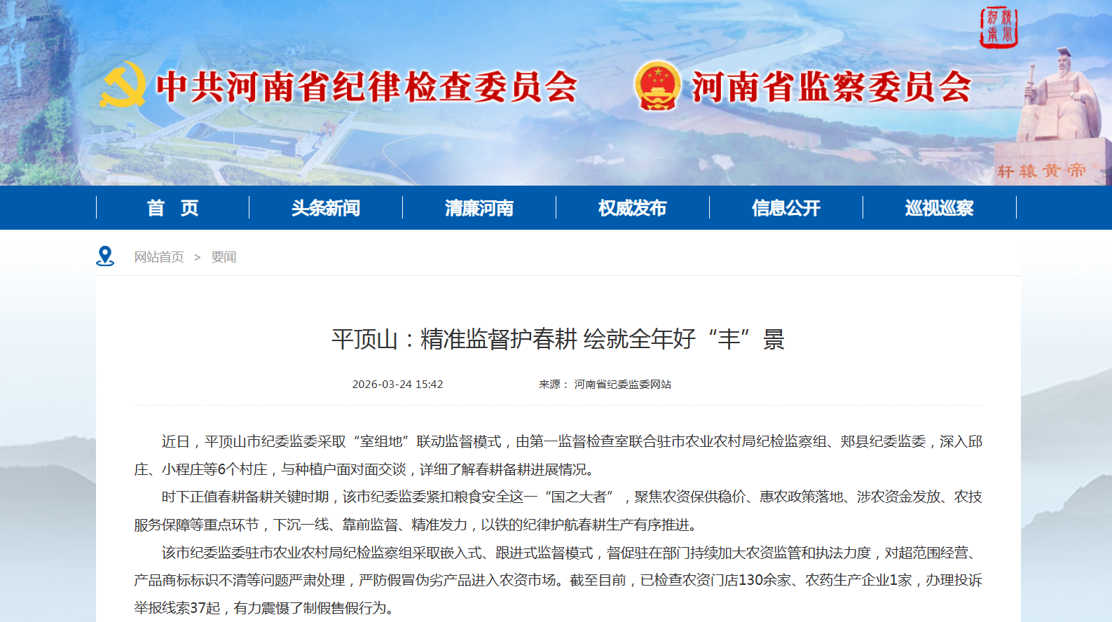 近日,平顶山市纪委监委采取“室组地”联动监督模式,由第一监督检查室联合驻市农业农村局纪检监察组、郏县纪委监委,深入邱庄、小程庄等6个村庄,与种植户面对面交谈,详细了解春耕备耕进展情况。