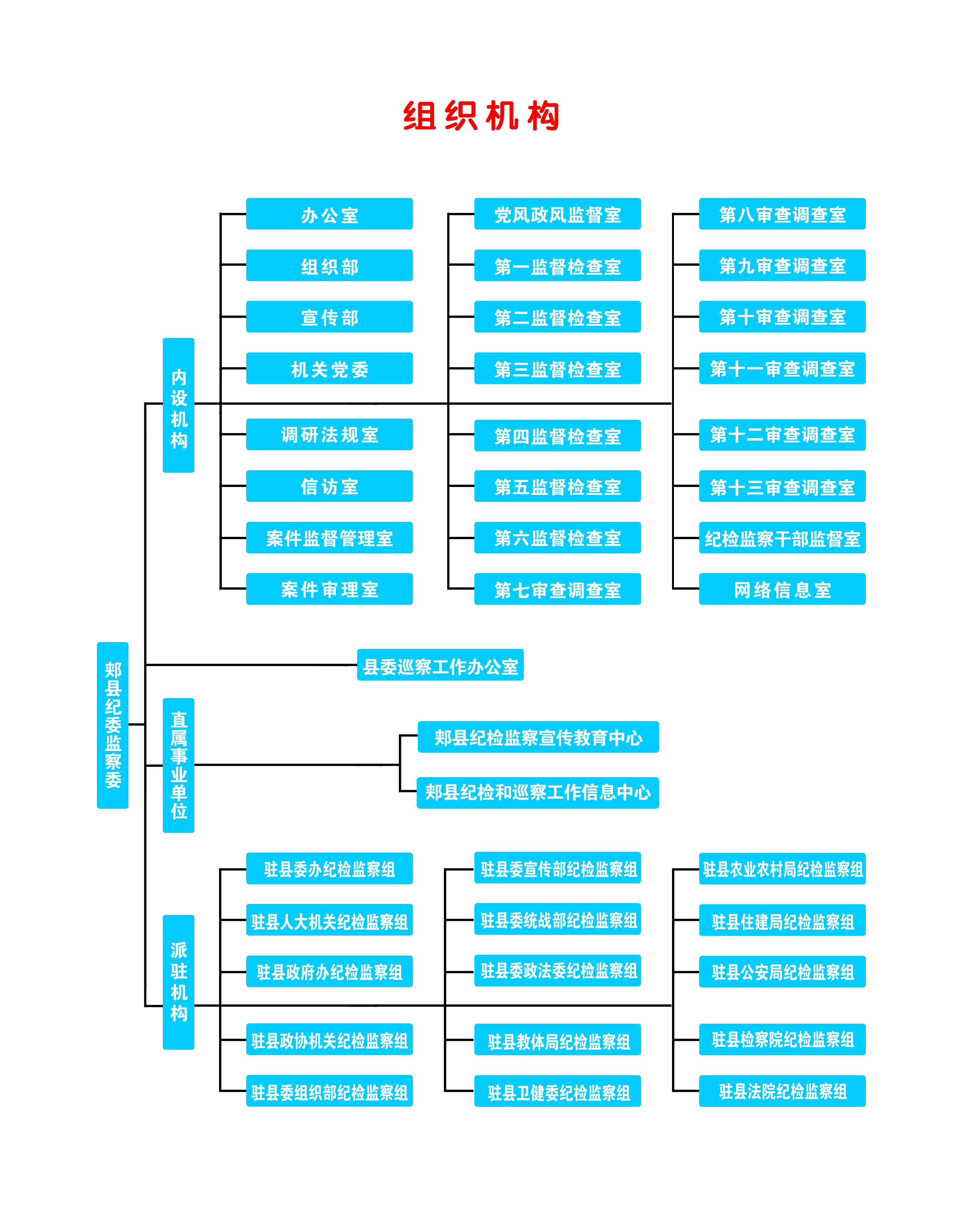 郏县纪委机关与郏县监察委合署办公,共有24个内设机构,分别为:办公室、组织部、宣传部、机关党委、调研法规室、信访室、案件监督管理室、案件审理室、党风政风监督室、第一监督检查室至第六监督检查室、第七审查调查室至第十三审查调查室、纪检监察干部监督室、网络信息室。