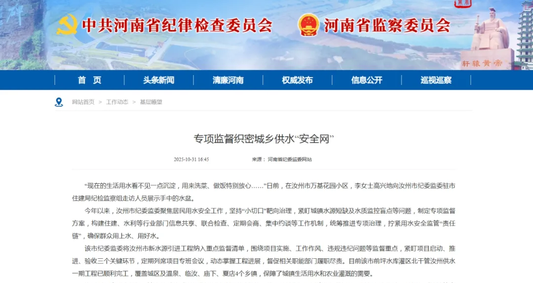 今年以来,汝州市纪委监委聚焦居民用水安全工作,坚持“小切口”靶向治理,紧盯城镇水源短缺及水质监控盲点等问题,制定专项监督方案,构建住建、水利等行业部门信息共享、联合检查、定期会商、集中约谈等工作机制,统筹推进专项治理,拧紧用水安全监管“责任链”,确保群众用上水、用好水。
