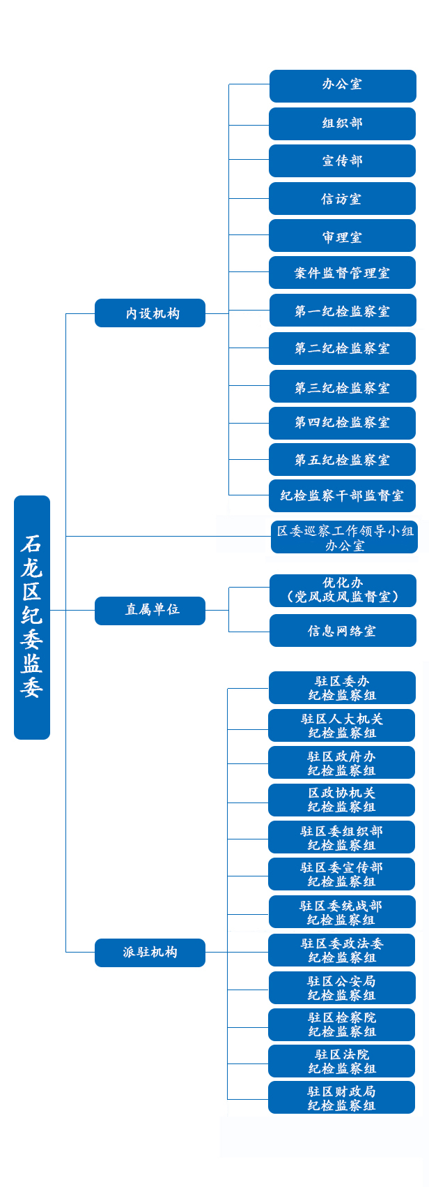 派驻机构:驻区委办纪检监察组、驻区人大机关纪检监察组、驻区政府办纪检监察组、区政协纪检监察组、驻区委组织部纪检监察组、驻区委宣传部纪检监察组、驻区委统战部纪检监察组、驻区委政法委纪检监察组、驻区公安局纪检监察组、驻区检察院纪检监察组、驻区法院纪检监察组、驻区财政局纪检监察组。