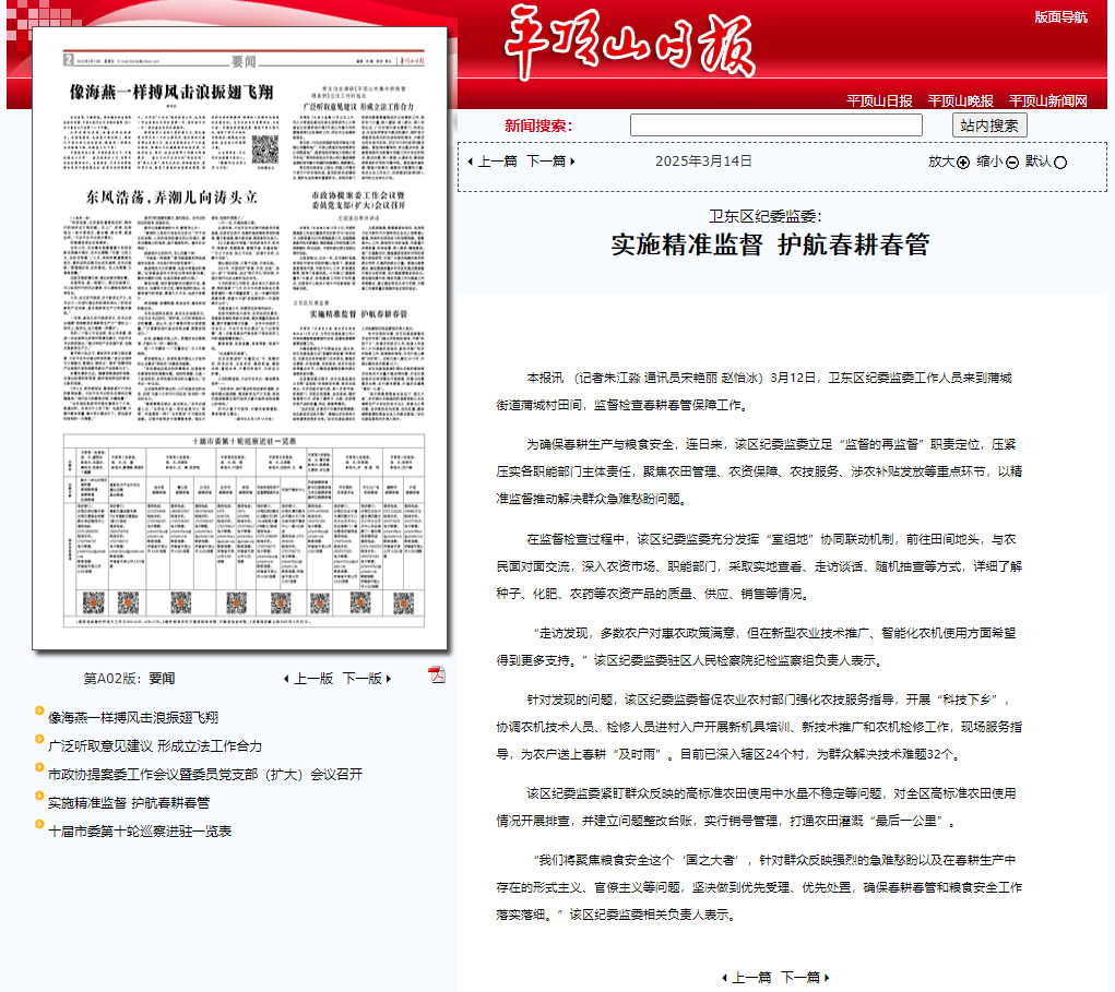 为确保春耕生产与粮食安全,连日来,该区纪委监委立足“监督的再监督”职责定位,压紧压实各职能部门主体责任,聚焦农田管理、农资保障、农技服务、涉农补贴发放等重点环节,以精准监督推动解决群众急难愁盼问题。