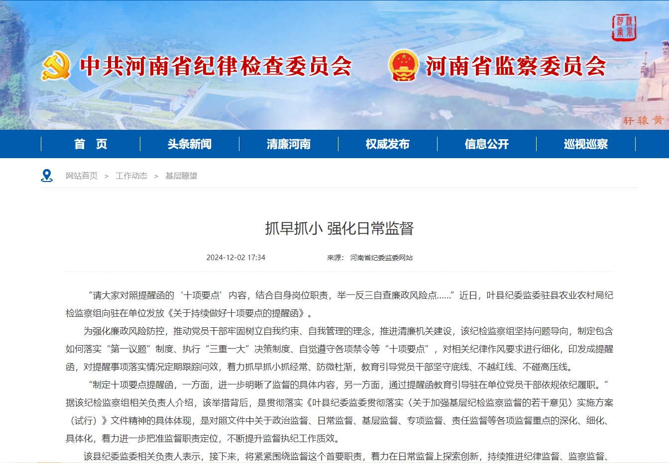 “制定十项要点提醒函,一方面,进一步明晰了监督的具体内容,另一方面,通过提醒函教育引导驻在单位党员干部依规依纪履职。”据该纪检监察组相关负责人介绍,该举措背后,是贯彻落实《叶县纪委监委贯彻落实〈关于加强基层纪检监察监督的若干意见〉实施方案(试行)》文件精神的具体体现,是对照文件中关于政治监督、日常监督、基层监督、专项监督、责任监督等各项监督重点的深化、细化、具体化,着力进一步把准监督职责定位,不断提升监督执纪工作质效。