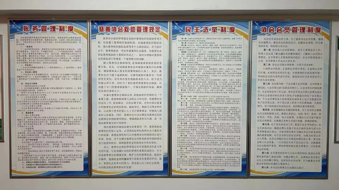 严格按照《慈善法》、《章程》和县民政局社会组织管理要求,先后完善了会员代表大会、理事会、监事会、项目(专项资金)管理,物资捐赠管理,机关内部财务管理等多项制度,不断规范工作流程,严格款物拨付程序,形成了用制度管人、管事,管好、用好善款的良好局面。