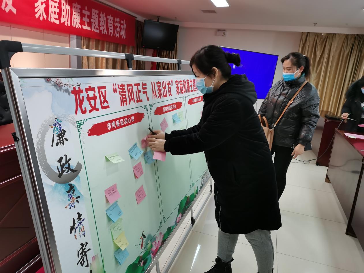 龙安区纪委监委紧盯领导干部这个“关键少数”,制定《关于加强对“一把手”和领导班子监督的若干措施》,开展纪委书记同下级“一把手”监督谈话,同时针对各单位主要领导干部开展常态化廉洁教育和警示教育,做到监督教育常在。图为龙安区纪委监委邀请各单位“一把手”家属参加清廉家风建设主题活动,为配偶手写廉洁寄语。(黄若琳 摄)