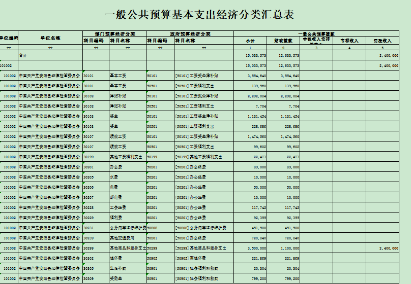 按照《财政部关于印发 < 支出经济分类科目改革方案 > 的通知》(财预〔 2017 〕 98 号)要求,为适应改革要求,我 单位 《支出经济 分类汇总表》由上年仅反映一般公共预算基本支出经济分类科目预算,调整为按两套经济分类科目分别反映不同资金来源的全部预算支出。 科目编码 科目名称 科目编码 科目名称 财政拨款 30101 基本工资 50101 [50101] 工资奖金津补贴 3,554,640 30101 基本工资 50501 [50501] 工资福利支出 139,560 30102 津贴补贴 50101 [50101] 工资奖金津补贴 2,292,084 30102 津贴补贴 50501 [50501] 工资福利支出 7,704 30103 奖金 50101 [50101] 工资奖金津补贴 1,131,454 30103 奖金 50501 [50501] 工资福利支出 228,686 30107 绩效工资 50101 [50101] 工资奖金津补贴 1,474,560 30107 绩效工资 50501 [50501] 工资福利支出 99,602 30199 其他工资福利支出 50199 [50199] 其他工资福利支出 22,473 30201 办公费 50201 [50201] 办公经费 89,000 30205 水费 50201 [50201] 办公经费 10,000 30206 电费 50201 [50201] 办公经费 50,000 30207 邮电费 50201 [50201] 办公经费 10,000 30228 工会经费 50201 [50201] 办公经费 117,742 30229 福利费 50201 [50201] 办公经费 92,355 30231 公务用车运行维护费 50208 [50208] 公务用车运行维护费 451,500 30239 其他交通费用 50201 [50201] 办公经费 720,840 30299 其他商品和服务支出 50299 [50299] 其他商品和服务支出 1,100,000 30302 退休费 50905 [50905] 离退休费 221,869 30305 生活补助 50901 [50901] 社会福利和救助 20,304 30309 奖励金 50901 [50901] 社会福利和救助 799,200