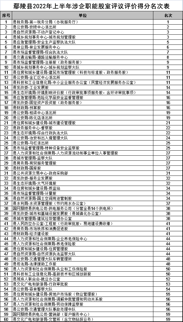附件:鄢陵县2022年上半年涉企职能股室评议评价得分名次表