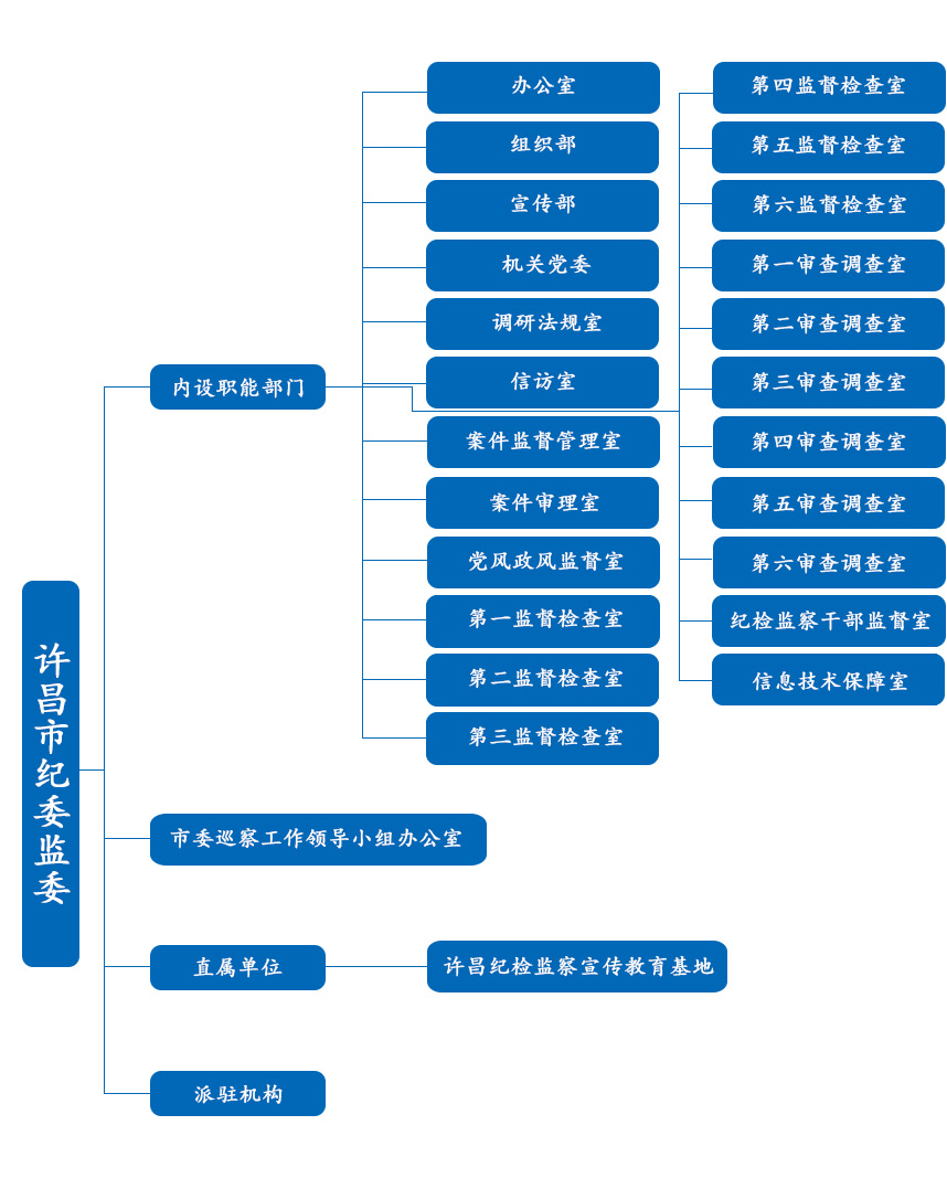中共许昌市纪律检查委员会与许昌市监察委员会合署办公,共有22个内设机构和机关党委,分别为:办公室、组织部、宣传部、机关党委、调研法规室、信访室、案件监督管理室、案件审理室、党风政风监督室、第一监督检查室至第六监督检查室、第一审查调查室至第六审查调查室、纪检监察干部监督室、信息技术保障室。下属1个事业单位:许昌纪检监察宣传教育基地(许昌市监察委员会留置管理中心)。实行统一管理的派驻机构30个。