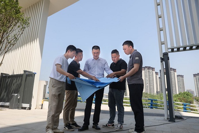 图为万东东(中)在现场查看廉政教育基地建设施工进度。吴小飞 摄