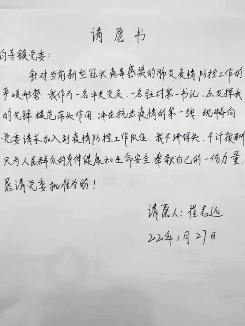 看到《中共商水县委组织部疫情防控倡议书》和《商水县纪委监委致全县党员干部、公职人员告知书》后,崔志远连夜写下《请愿书》,于1月28日递交到白寺镇党委书记张慧手中。