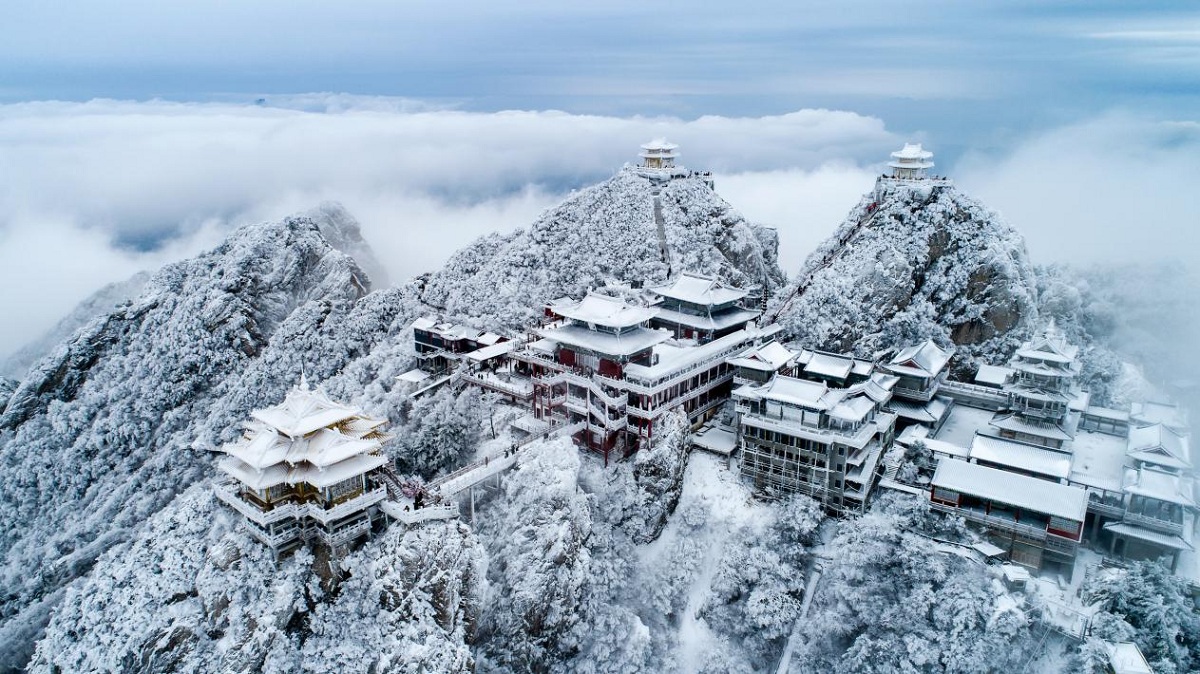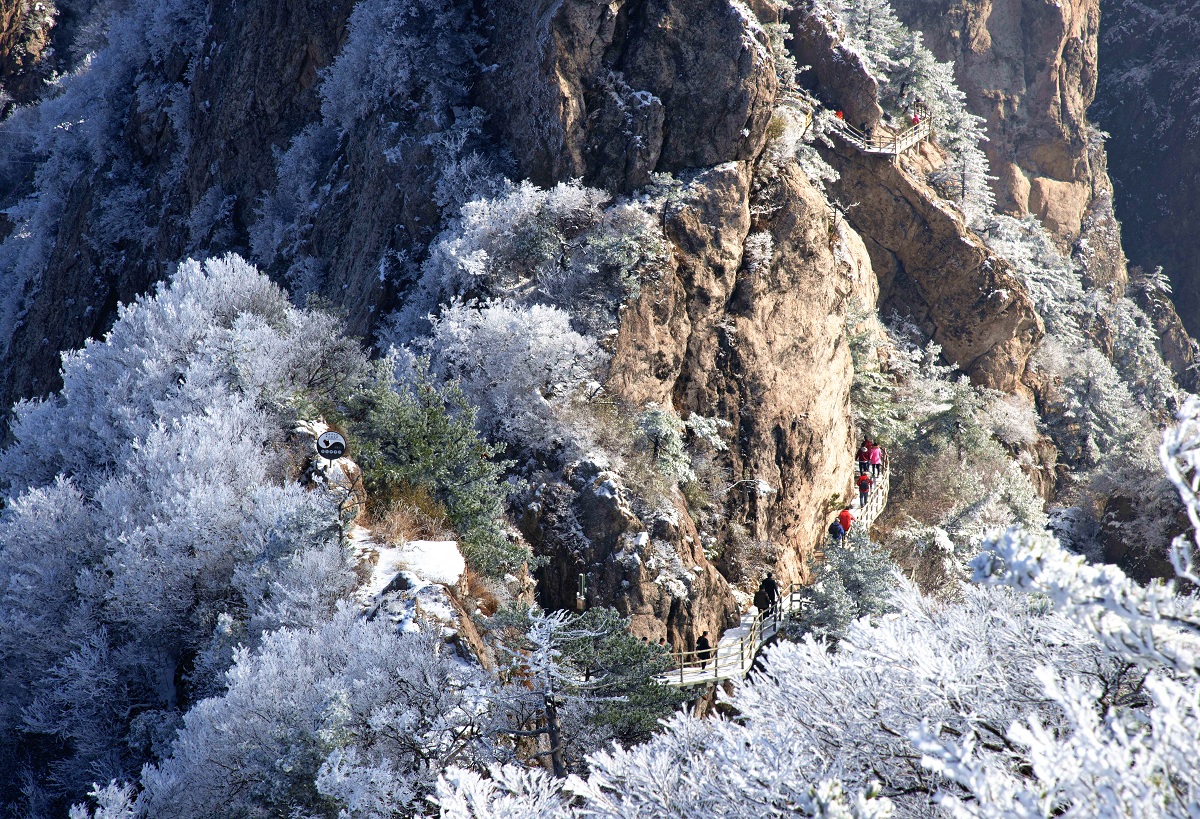 老君山山势险峻、气势雄浑。初冬的一场雪后,山顶白雪皑皑、银装素裹,山间云雾缭绕、如梦似幻,游人穿行期间,仿佛一不小心就步入了童话般的“冰雪幻境”。(栾川县纪委监委 王文会 摄)