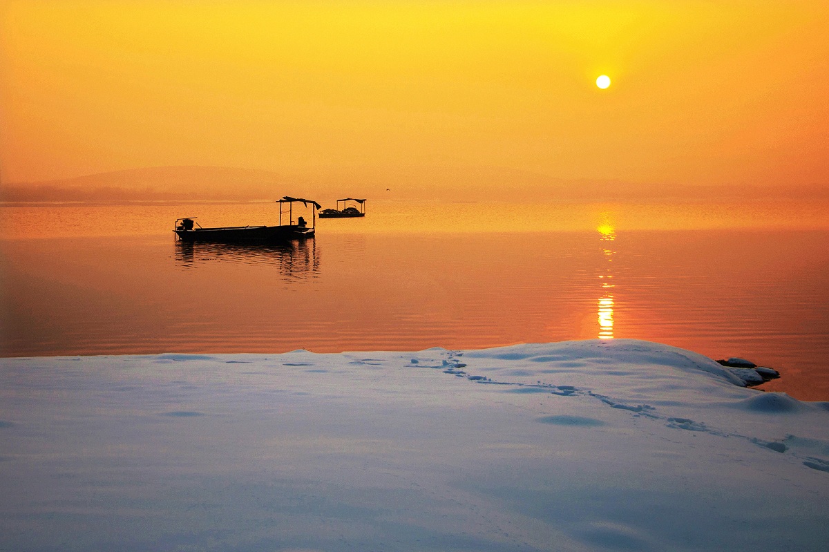 涟漪的湖面、洁白的雪地、金色的夕阳,组成了一幅恬然自得的优美画卷。(三门峡市纪委监委 周利民 摄)